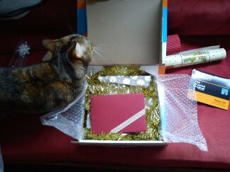 Ouverture du colis, avec Sockette l'éternelle curieuse ! Et de jolies guirlandes dorées pour protéger le tout.