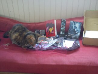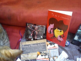 Vous remarquerez que sockette est toujours très intéressée parce que je renferme ce colis. Elle a essayé de me choper une ou deux choses pour jouer mais j’ai été vigilante ;). Dans ce colis il y avait donc :