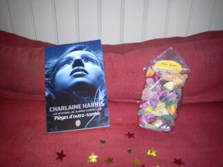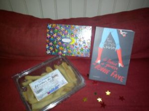 Début décembre j’ai participé au concours de Noël organisé chez P’tite boukinette. J’y avais participé sans vraiment espérer et qu’elle ne fut pas ma surprise d’être la gagnante !!! J’avais donc droit au livre de mon choix, à une gourmandise et à une surprise. Je lui ai donné une sélection de 3/4 titres, pour lui faciliter la tâche et avoir encore plus la surprise à la réception. Le temps de rassembler les petites choses du colis, de passer les fêtes et voilà le colis arrivé chez moi ce matin ! ^^
