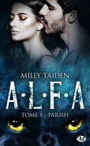 A.L.F.A. tome 1, Parish de Milly Taiden (Milady le 19) Résumé : La brillante scientifique Melinda Caster a découvert une nouvelle souche de virus qui développe l’intelligence animale bien au-delà des facultés humaines, allant jusqu’à leur donner des capacités presque surnaturelles. Lorsque son laboratoire est cambriolé et ses recherches mises en danger, l’A.L.F.A. dépêche l’agent Parish Hamel, un métamorphe jaguar, pour enquêter sur l’affaire. Mais l’importance de cette découverte est peu de chose comparée à celle que fait Parish  : que celle qu’il doit protéger est son âme sœur…